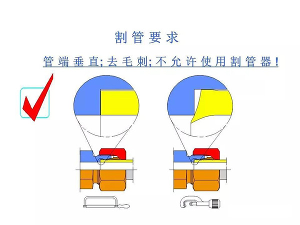 正确的做法应该是,管子一端用什么样的接头体连接,对应的连接端就要用相同类型的接头预装,这样能最大限度地避免引起泄漏问题。详细做法是:用一个接头体作为母体,将螺母、卡套压紧到管子上即可。管径小的接头可以在台钳长进行预装。如果在预装时卡套变形严峻,会失去密封作用。管子锯断后应在砂轮等工具上打磨平齐,并且去除毛刺,清洗并用高压空气吹净后再用。一般需要专用的预装器。